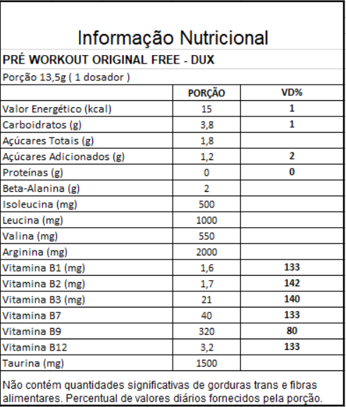 Pre Workout Stim Free DUX Human Health foi desenvolvido para oferecer energia e foco sem cafeína. Entre os ingredientes principais está a taurina, que apoia a resistência e a recuperação muscular, além de favorecer a saúde cardiovascular e ajudando a manter o foco durante o treino. Com BCAAs para síntese de proteínas e redução da fadiga, beta-alanina para aumentar a resistência muscular, e água de coco para hidratação e reposição de eletrólitos, a fórmula é completa. O complexo de vitaminas B também contribui, ajudando o metabolismo energético e o suporte ao sistema nervoso, mantendo você com energia e concentração.