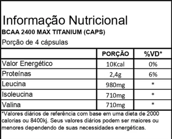 BCAA 2400 100 CÁPSULAS são aminoácidos essenciais aqueles que o corpo é incapaz de produzir, razão pela qual devem ser ingeridos na alimentação. Dentre os aminoácidos essenciais, 3 deles são chamados BCAA's, abreviação para “Branched Chain Amino Acids”, ou seja, “Aminoácidos de Cadeia Ramificada”. São eles: LEUCINA, ISOLEUCINA E VALINA, que são obtidos exclusivamente através de dieta ou de suplementação.