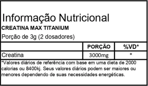 CREATINE 300G Max Titanium é formada a partir da associação de três aminoácidos de alto valor biológico: arginina, glicina e metionina e está presente naturalmente em nosso organismo, onde cerca de 95% do conteúdo de creatina é armazenada no músculo esquelético. Ela exerce um papel importante na contração muscular, servindo como uma reserva de energia em atividades físicas de curta duração, alta intensidade e com curtos períodos de recuperação, melhorando a resposta fisiológica e aumentando a produção de força máxima.